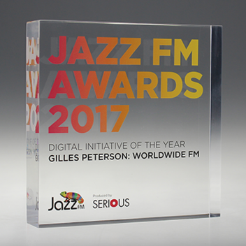 The Jazz FM Awards is a joint collaboration between the radio station and Serious. The cachet of winning one of the EFX-made trophies is proof of the event’s international standing. Stylishly simple, and a manageable single-hand-hold size, the trophy design is manufactured in thickset, clear acrylic and finished with crisp, encapsulated print detailing.