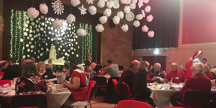 This year, the day included a traditional, three-course Christmas lunch, festive entertainment, carols and gifts. The extensive planning beforehand ensured the day was immensely enjoyable for both guests and volunteers. The local hall was decorated, cards made by the local primary school, chairs transformed with home-sewn covers and gifts for everyone secured and wrapped.  Sarah was in charge of the entertainment and had arranged for the local town band and local pianist to join in the celebrations and led the carol singing.