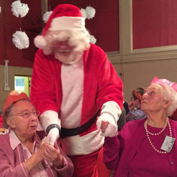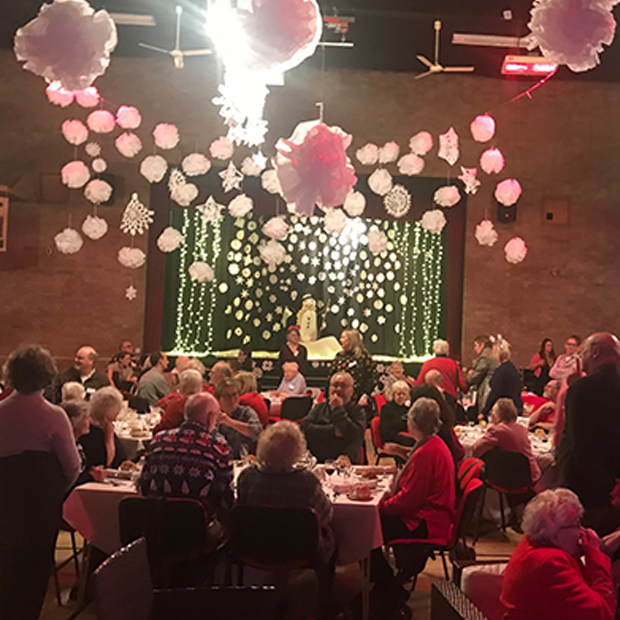 This year, the day included a traditional, three-course Christmas lunch, festive entertainment, carols and gifts. The extensive planning beforehand ensured the day was immensely enjoyable for both guests and volunteers. The local hall was decorated, cards made by the local primary school, chairs transformed with home-sewn covers and gifts for everyone secured and wrapped.  Sarah was in charge of the entertainment and had arranged for the local town band and local pianist to join in the celebrations and led the carol singing.