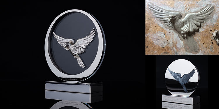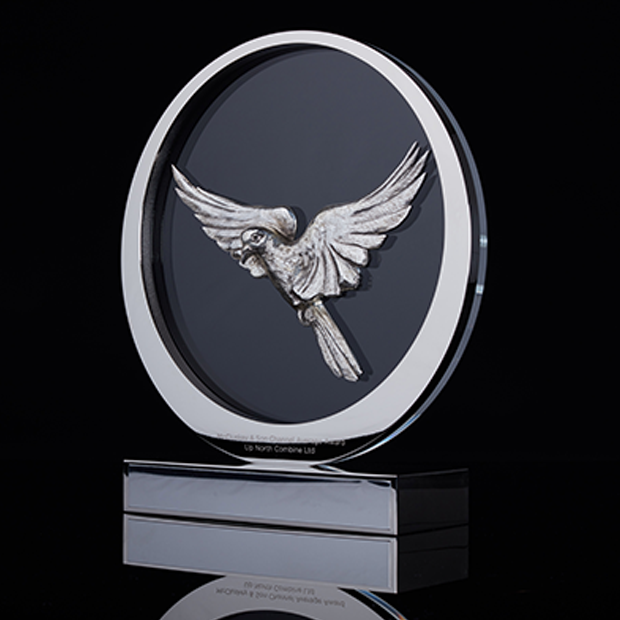 Commissioned by the family of Fred McCluskey (1953-2016), the Up North Combine Ltd Channel Average Award depicts a pigeon in flight, racing for home. The creation of this sterling silver trophy is inspired by Fred’s love of breeding and racing pigeons and pays tribute to a special man. It is hand-modelled and cast in hallmarked sterling silver, mounted on clear acrylic encircled with a mirror-finished frame and stands on an engraved, nickel-plated plinth.
