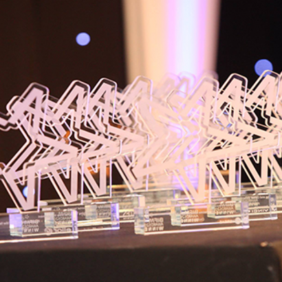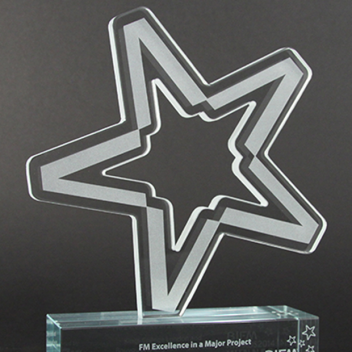 The star symbol is often employed to denote the outstanding and special. Many of us remember being awarded stars, in a variety of colours, for outstanding work at school, whilst in business the star is widely recognised as a symbol which highlights excellence. The star is therefore a very fitting tribute to the winners of the BIFM Awards 2014 (British Institute of Facilities Management). EFX designed and manufactured the bespoke trophies, using clear white glass, pierced in the centre and decorated with laser-precision clarity. The winners this year included J+J Flooring (Excellence in Product Development) and Carillion Plc (Large FM Service Provider of the Year), amongst others; they were presented with their personalised trophies at the BIFM Awards 2014, held at The Grosvenor House Hotel, 13th October.