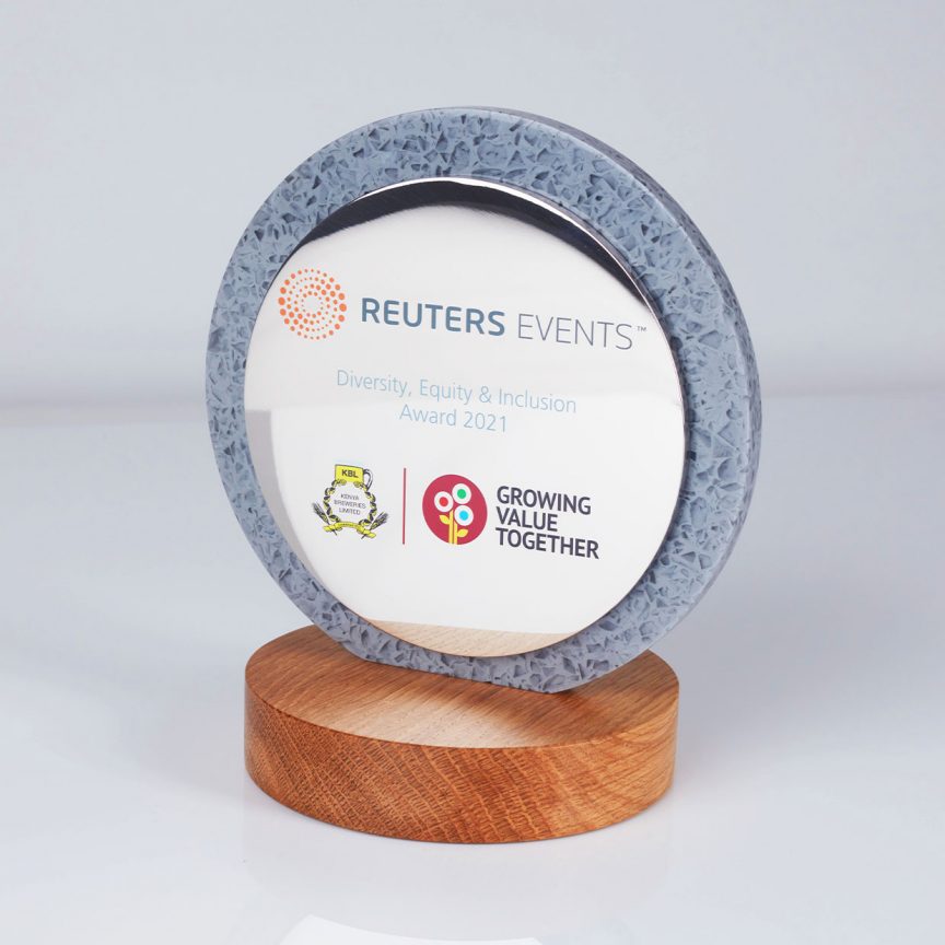 The acrylic and wooden award features a recycled grey chip acrylic and oak wood combined with a high shine aluminium disc for the all-important winner’s details. Recycled acrylic creates a great speckled effect, with the option of many different colours, from grey through to multicoloured to suit your preference. Winning categories included, Future Pioneer, Social Impact, Biodiversity Champion, Business Transformation and Sustainability Trailblazer!