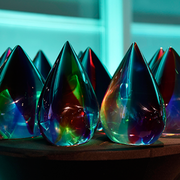 The outer shell of the awards is made in clear acrylic, meticulously machined into a beautifully tactile tear-drop or bud shape. The inner ‘taste’ elements of the ‘bud’ are individually made in coloured acrylic, machined to appear seamlessly melded together. An engraved gold plate on the base displays the winners’ details.
