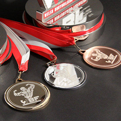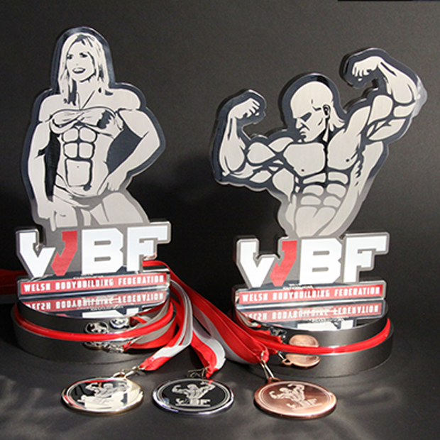 The two trophies depict a female and male form of a powerful body builder. The 3D torsos were precision water jet cut from solid aluminium and the all important muscle definition was then skilfully laser engraved onto the surface. Each body is mounted on a podium styled, three-tiered base, laser engraved and sporting a dashing red acrylic middle layer. The gold, silver and bronze medals continue the theme.