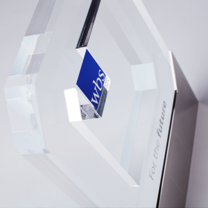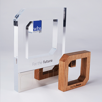 Each team member of the prize-winning proposal is now the proud owner of an exclusive WBS-designed trophy, sympathetically worked in sustainable oak, pierced in the centre and engraved. The design reflects aspects of WBS’s cube-shaped branding as the primary visual theme. The perpetual team trophy complements the individual sustainable trophy design and is manufactured in a nickel plated finish, accented with acrylic.
