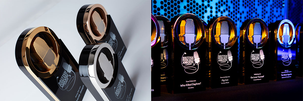 Featuring the signature microphone essential for podcast recording, these were pierced for detail on the metal layer and had either a nickel plated, 18ct rose gold plated or 24ct gold plated layer on printed black acrylic to show your standard ‘gold, silver and bronze’ style awards within each category at the event. The awards looked fantastic on the night and proved popular with the guests attending – ‘The trophies looked amazing last week, we had so many compliments on them which is great. Thank you so much!  The people loved them so much…. They looked so good. Really stood out on stage and the metal really shined in photos.’ Said a spokesperson for the BPAs.
