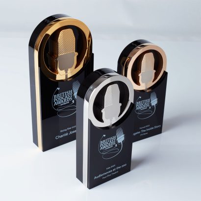 Featuring the signature microphone essential for podcast recording, these were pierced for detail on the metal layer and had either a nickel plated, 18ct rose gold plated or 24ct gold plated layer on printed black acrylic to show your standard ‘gold, silver and bronze’ style awards within each category at the event. The awards looked fantastic on the night and proved popular with the guests attending – ‘The trophies looked amazing last week, we had so many compliments on them which is great. Thank you so much!  The people loved them so much…. They looked so good. Really stood out on stage and the metal really shined in photos.’ Said a spokesperson for the BPAs.