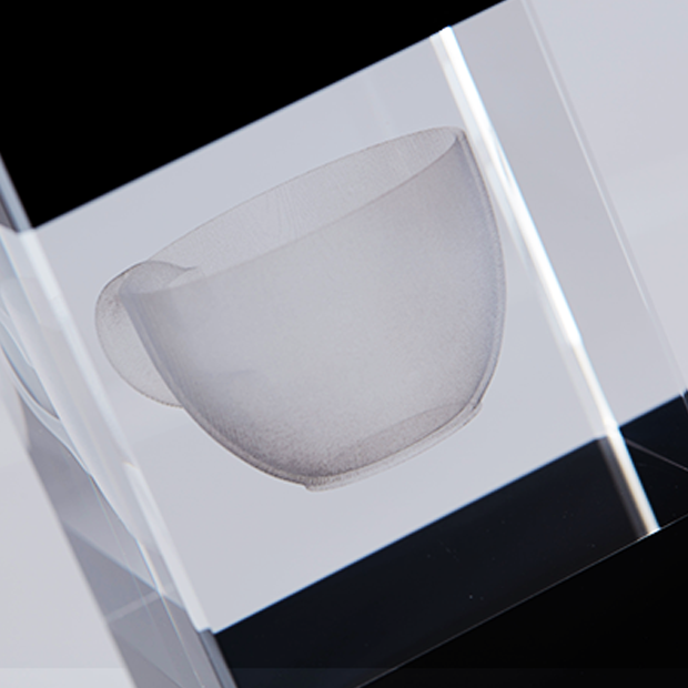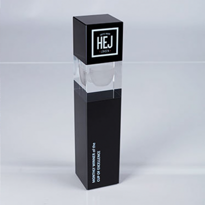The Special EFX studio has created an ingenious trophy design, featuring a miniaturised replica of a Hej coffee cup, within the trophy. The cup is engraved as a three-dimensional design inside a crystal cube, which is mounted on a contrasting black onyx crystal tower. The resulting trophy is as intriguing as it is impressive and the client loves it: “I couldn’t be happier with the way the trophy has turned out. They have taken our trademark coffee cup and turned it into a piece of art”.