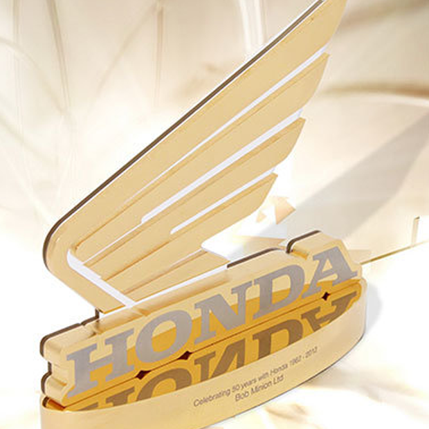 For several years we have produced the podium trophies for the high octane British Grand Prix (MotoGP), held at Silverstone. Each year, the studio brain storms and comes up with a stunning new design to endorse the razzmatazz of the event. We are also expert at replicating the Honda Wing logo, which we water-jet cut from solid aluminium and then plated in gold.