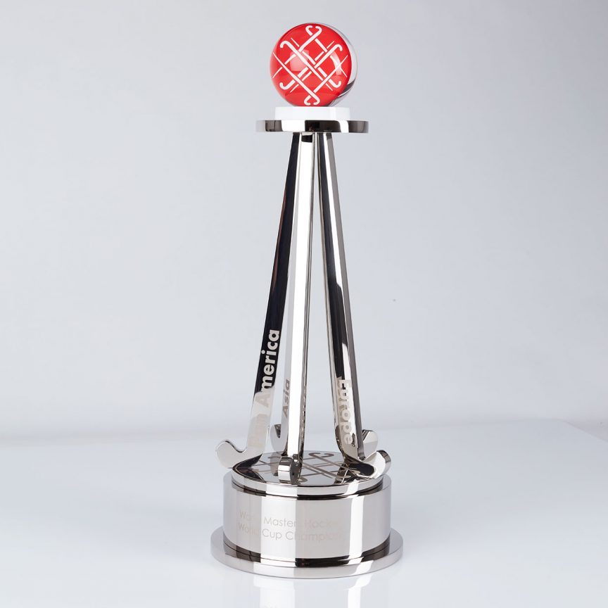 Each of the polished nickel-plated aluminium hockey sticks is engraved with the name of one of the 5 Continental Hockey Federations and the WMH logo is encapsulated in a clear acrylic ball reflecting its vibrant red colour. The logo is also repeated on top of the reflective base for a seamless flow to the award. The delighted client commented that ‘Everyone who has seen the real trophy and its photographs, likes it. I am confident that it will create the required impact that every World Cup trophy should, and its rather unique style and appearance is unlike any trophies I have ever seen’.
