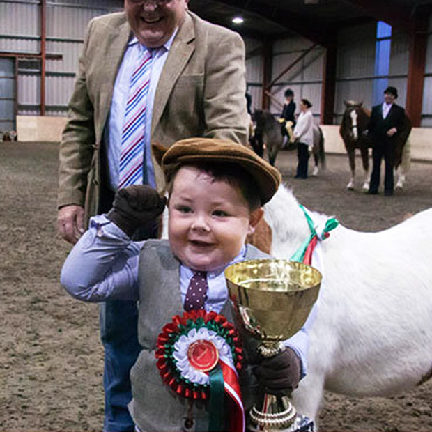 The category he won was for showing horses – or a pony in his case. Dressed the part in a mini waistcoat, dinky tie, long trousers, gloves and flat cap set at a jaunty angle, he evidently won the hearts of the crowd…and the judges. He manfully ran the length of the full size ring, putting his Shetland, Toffee, through its paces to impress the judges. A tall order to remember, let alone do, especially when you are only three!