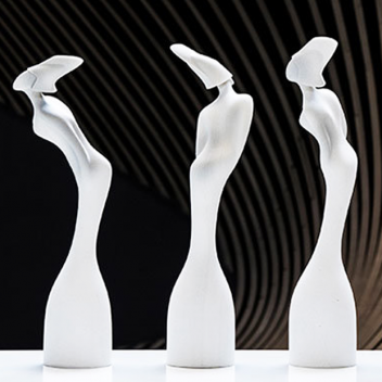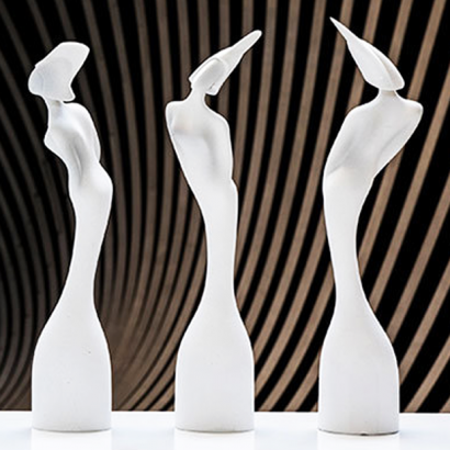 To create a similarly unique sculptural award for your event could be achieved with 3D printing and a metallic finish. 3D printing is ideal for individual or low numbers of complex trophy designs. A traditional way of creating such sculptural forms would have been to hand-model them in clay and then fire them, creating a china figurine or statue; you can also create a mould and manufacture multiple numbers in a number of materials, including bronze or ceramic. In such instances, the talents of the original sculptor and the firing or casting of the figures determine the ultimate appearance and appeal of the statue. In contrast, 3D printing takes the original 3D design and faithfully copies it.